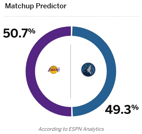 ESPN更新了兩支球隊(duì)G4的勝率,其中湖人50.7%略占優(yōu)勢(shì),森林狼49.3%。